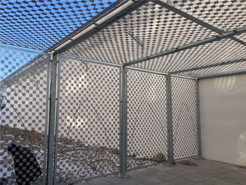 (3)單層梅花刺片網(wǎng),網(wǎng)片用直徑6mm的SUS304不銹鋼園鋼或鍍鋅鋼絲制作,網(wǎng)格尺寸為:對邊100mmx100mm,成菱形狀網(wǎng)格結(jié)合點(diǎn)媒接梅花刺片,梅花刺片直徑為70mm。梅花刺片度為1.2mm,采用SUS304不鋼鋼板或鍍鋅鋼板沖壓成型
