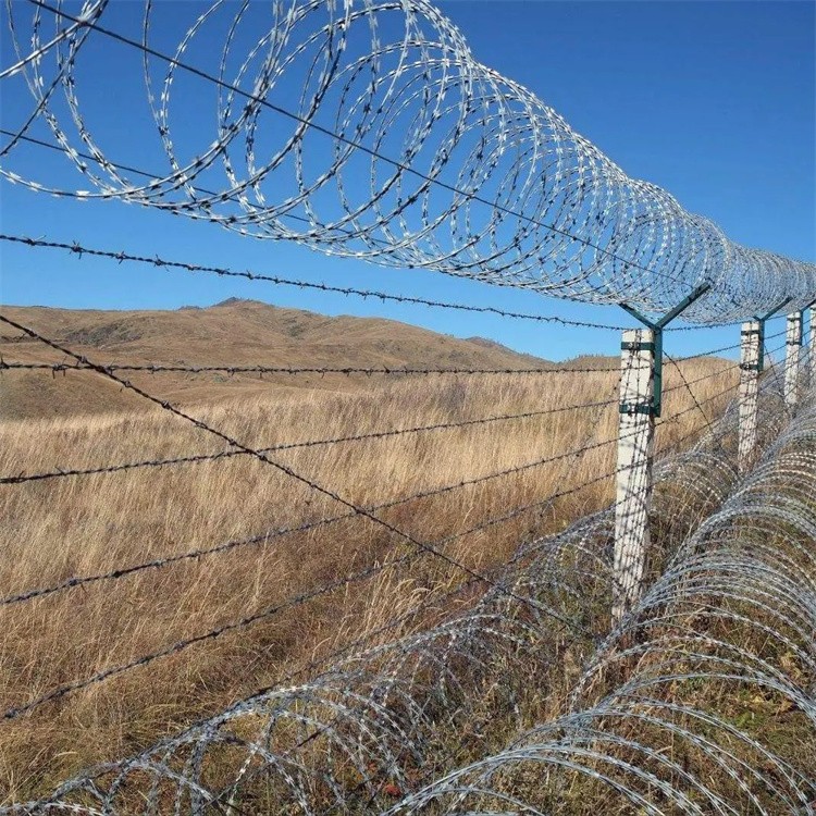 刀片刺網原材料:優質的低碳鋼絲(電鍍鋅,熱鍍鋅,涂塑,噴塑)絲,有藍、綠、黃等顏色。 用途: 用于草場邊界、鐵路、高速公路的隔離防護等。