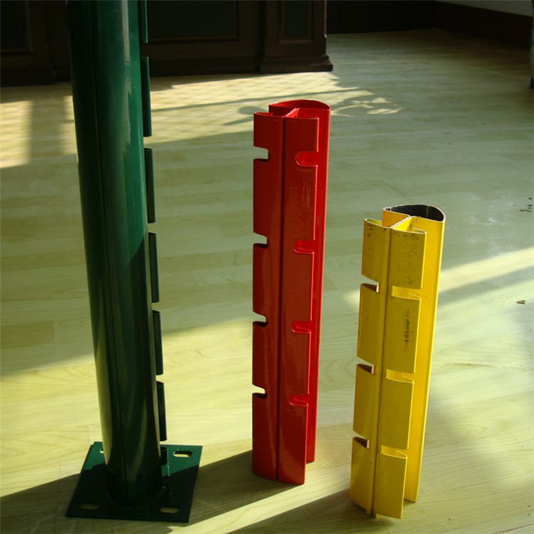 桃形柱圍欄的柱子的厚度為1-1.2毫米,由機器冷壓彎曲而成。圓柱體的外側是橢圓形的。內側的兩塊板連接后,網格向外彎成U形,即為鉤部。為了便于桃形柱與網格的連接,根據柱內網格的網格大小,沿柱的長度均勻設置N組鉤狀缺口,分布在柱的兩側。U型掛鉤的外部為橢圓形,與立柱的直邊相切,有效防止撬起,保證護欄防撬的安全性能。