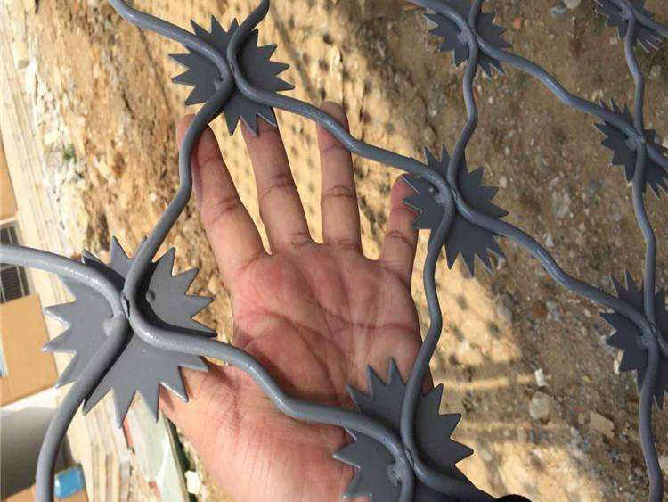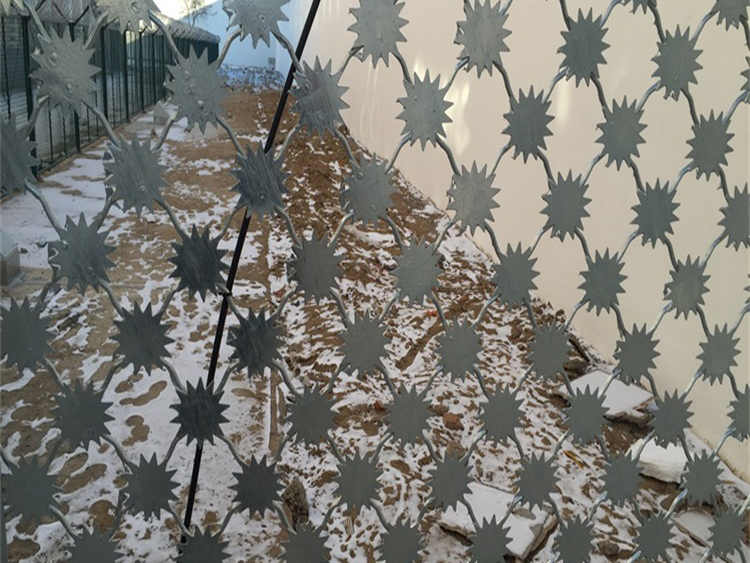 梅花刺隔離網安全性能高且具有嚇阻、防翻越等效果,材質堅硬,高強度,高張力,造型設計獨特,不宜觸摸,因而能達到防護隔離效果。主要用于監獄、哨所、邊防、圍禁區域、軍事防御防護等高危險地區的防護。