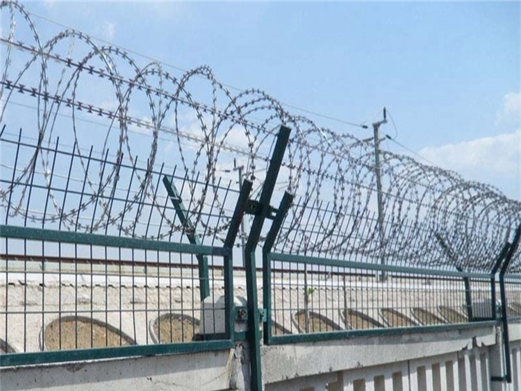 哨所加高雙螺旋刀片圍墻網產品特點:監獄防護網具有防腐、防老化、抗曬、耐候等特點。螺旋型交叉刀片刺網是在兩條刀片刺網之間以不銹鋼片和鍍鋅鋼片強力夾扣,展開后即呈交叉狀,美觀又實用。可平地安裝,也可在圍墻上二次安裝,有效防止攀逃。直刺式刺網隔離帶,是用柱體和普通刺繩橫、縱、斜向交叉綁定成刺網隔離帶。