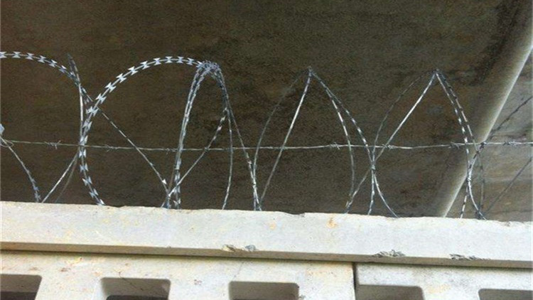 (4)支架在圍墻上的固定方法一般為底盤打膨脹螺絲固定。固定好后,方可進行蛇腹形刀刺網安裝。