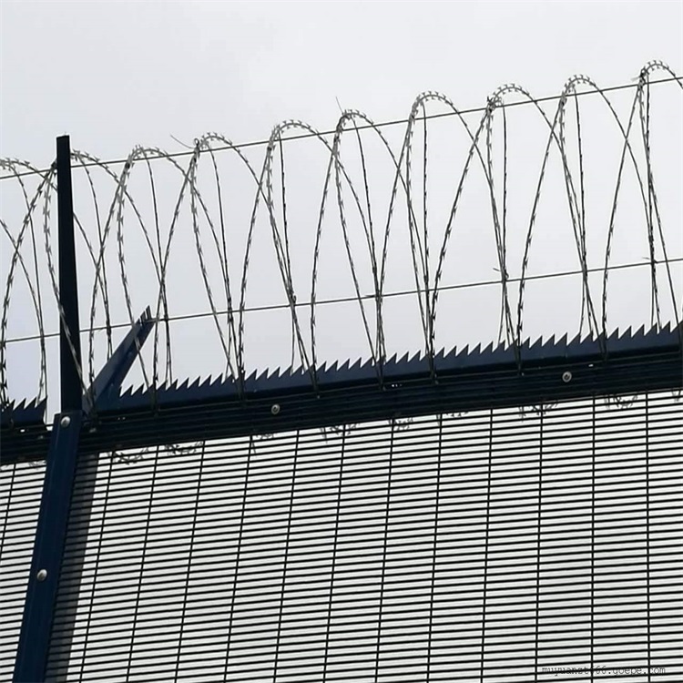 艾瑞監獄防逃網焊接的鐵絲網片形成75*150mm的網片至于上下螺旋刀片刺網的中間部分,安裝刀刺網的立柱采用50*60mm方管,壁厚在2—2.5mm ,高2.4米,底部2米國直線,上部0.4米向內折30度成斜線,立桂間隔為3米;長3米為一個單位:立柱表面涂黑綠色(注塑工藝),立柱配有連接件焊接的鐵絲網片和蛇腹網結合使用,使人望而卻步,擊破人的僥幸心理.