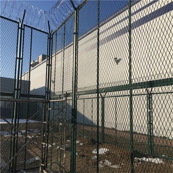 艾瑞監獄隔離網高度總體高度一般為:2.5米-4米高,立柱中心間距為3米,邊框為20X30方管,也有使用30X30或者30×50的方管網孔為70X150mm、50X100、 60X120等,絲 徑為:4mm-6mm立柱規格為:60X60、80×80、100X100方柱, V字高度為:50cm, 立柱壁厚:2mm-3.5mm。法蘭盈規格為:200X200X10mm, 整體全部采用鍍鋅材質浸塑或者靜電噴涂連接方式網片邊框打孔。立柱焊接邊耳用螺絲連接。立柱頂部加焊大V字型網片,用來支撐蛇腹型刀刺網,這樣組裝的監獄隔離網比較堅固!