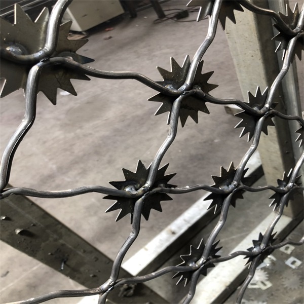 5. 刀片滾網(wǎng)、拉絲、卡扣,均采用不銹鋼材質(zhì)。刀刺網(wǎng)安裝固定卡扣整體調(diào)正,使刃刺網(wǎng)不出現(xiàn)擰轉(zhuǎn)情況,刀刺刺圈分布均勻,每隔30-40cm與拉絲固定;分段連接處需將兩端刀刺網(wǎng)做連接固定,刀刺網(wǎng)固定點需緊鎖不得出現(xiàn)松動、脫落現(xiàn)象:刀刺網(wǎng)安裝與隔離網(wǎng)平行,上下左右均成直線延伸,轉(zhuǎn)角處需做加密加固處理。