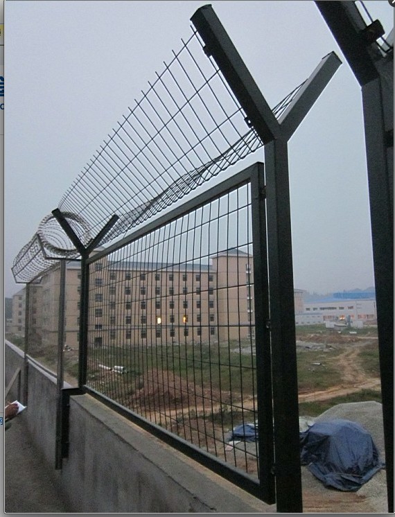 V字形單臂焊接固定鉤子,用來固定拉絲。然后把看守所刀刺網架于V型支架上面,用專門]的卡扣固定。是圍墻頂部用隔離網由V型支架立柱,加強型焊接片網,安全防盜連接件和熱鍍鋅刀片刺籠組成強度和安全防御性級別很高。近年來被廣泛應用在監獄、看守所、軍事基地等高安全場所,既起到圍欄作用,又起到美化作用。由于具有安全性高,防鐢爬能力好,網片連接方式采用特制SBS緊扣件有效防止人為的破壞性拆卸。