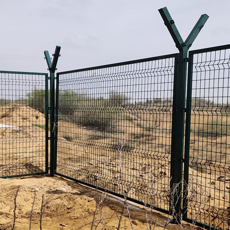 機場圍界隔離網又叫作Y型安全防御護網,由Y型支架立柱,上方加上焊接網片,在上面在加上刀刺網俗稱刺絲滾籠,近年來,被廣泛應用在監獄,軍事基地機場,光伏電站,油礦區等高安全場所。如果在機場封閉網頂部加裝刀片刺絲、刀片刺繩后又很好地增強了安全防護性能。也可以很好擋住動物還有外來人員的進入,阻礙飛機正常運行。
