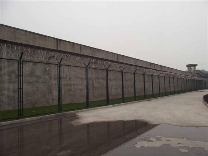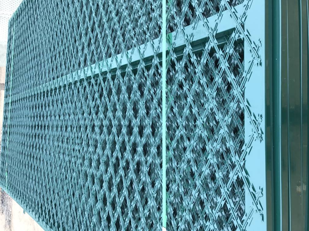 監獄鋼網墻一般頂端都設有V型支架與立柱焊接。材料通常選擇和立柱同等材料或者稍小規格材料搭配使用。V型支架的加裝是為了將蛇腹形刀刺網固定在鋼網墻頂部,從而有效的增加監獄鋼網墻的防攀爬性和安全性。V型支架加裝防拆卸刀刺網。刀刺網的直徑一般為500mm、600mm、800mm,材質均為優質304不銹鋼,鎳含量8個以上。刺網芯線直徑為2.5mm、刀片長22mm,刀片寬度15mm,刀片厚度0.5mm。 蛇腹形刀刺網的排列密度不小于16圈/米,相鄰每圈間距不大于120mm 。監獄用的刀刺網通常卡扣之間的距離是120mm,直徑500mm的刀刺網 ,覆蓋一米的重量約為2.38公斤(其他直徑的覆蓋長度可以詳細詢問安平縣艾瑞金屬絲網有限公司業務部,向您詳細解答)。監獄鋼網墻表面處理常分為熱浸鋅、浸塑、噴塑三種防腐處理。做完這些才能保證安全和基本10年左右的防腐。