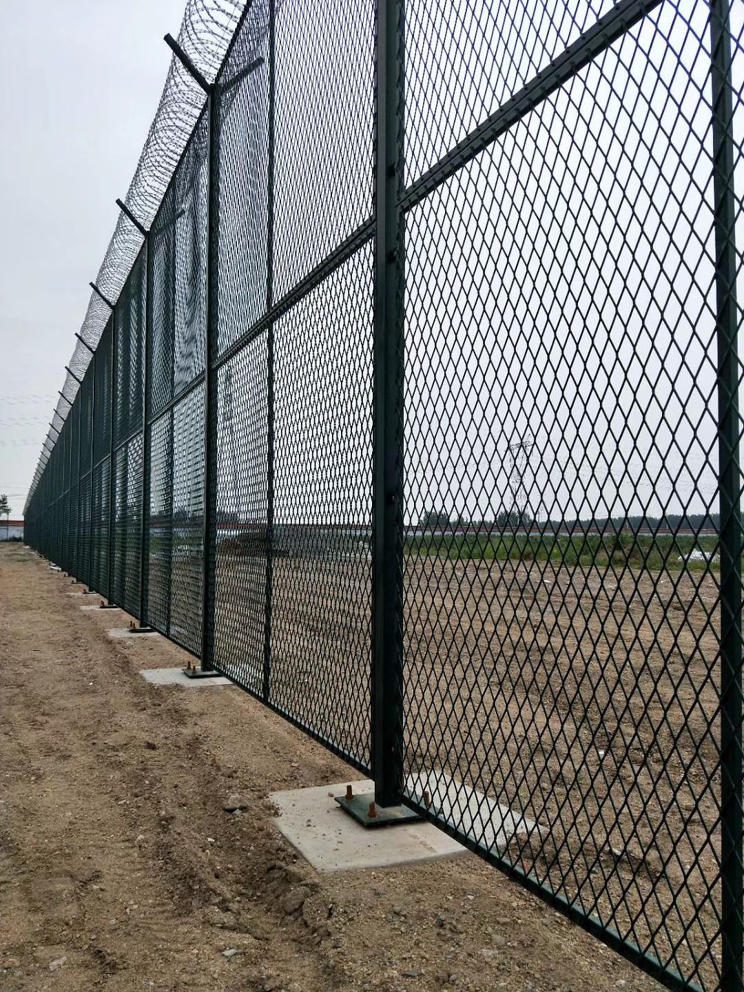監獄防護網通常采用鋼絲直徑為5mm、6mm、6.5mm,網孔采用50mm×100mm、50mm×50mm、50mm×200mm、50mm×150mm,組成結構:首先把網片焊接在鐵管框架上,框架是方管或者圓管焊接成的框架結構,在框架上焊接用于個立柱連接的連接板,用防盜螺栓與立柱連接。為了保證網片的防拆卸性能,網片連接方式采用特制防盜緊扣件,有效防止人為的破壞性拆卸。