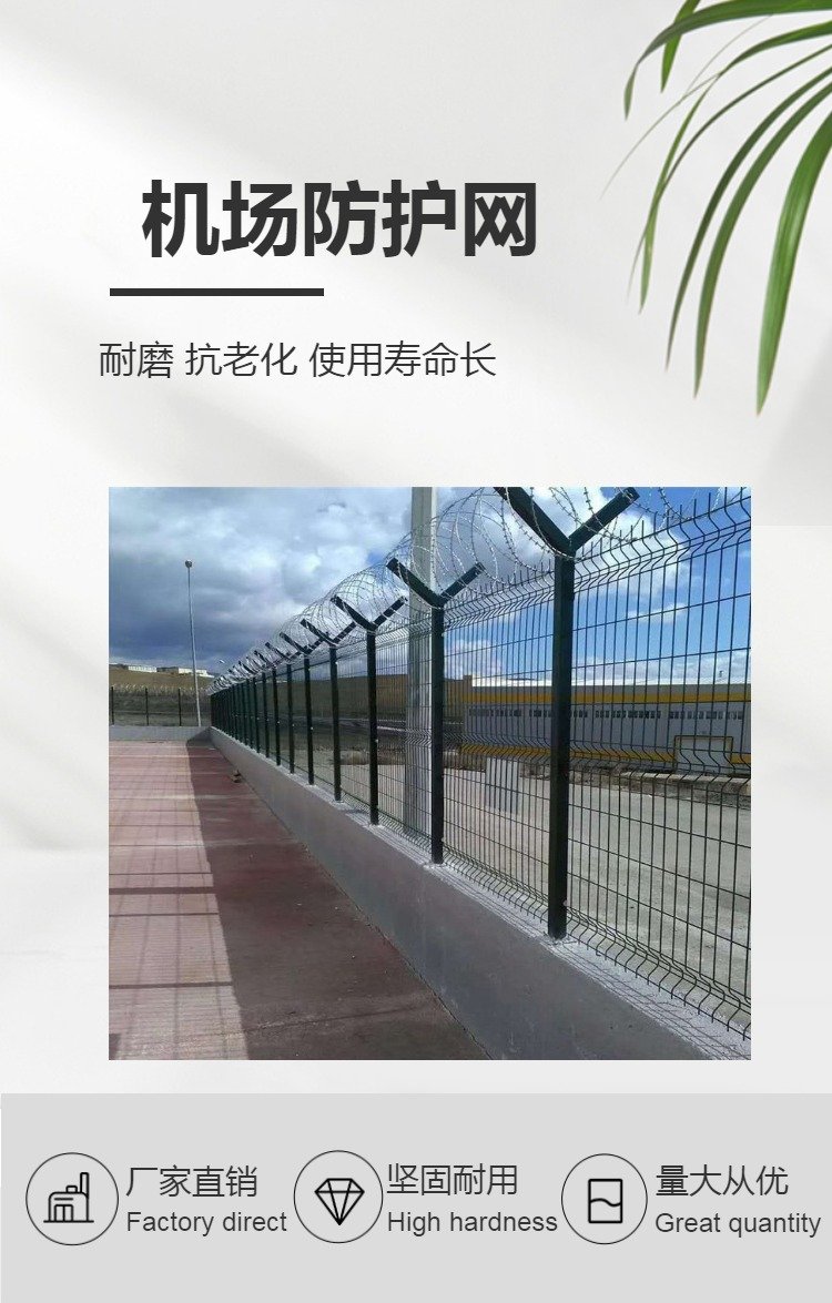 機場飛行區圍欄應用于機場跑道兩側的隔離網,作用是防止行人誤入跑道,影響飛機正常運行的有效措施。這個機場圍欄也分為機場內隔離與機場外隔離,機場內隔離的要求更高,頂部設置刀刺網,外隔離就比較簡單一些,主要還是防止閑雜或者違法人員進入飛行禁區,盡管這雙重保護之下,還是會有人進行每天巡邏,以防止個別情況發生。機場圍界廣泛應用于各大飛機場的邊界,用作邊界圍欄防護網,還可以用于港口圍界防護、碼頭鋼絲防護網、飛機場防護護欄網、Y型安全防御護網,也可以用于公園、動物園、賓館酒店、市政道路等周邊的安全防護圍網。