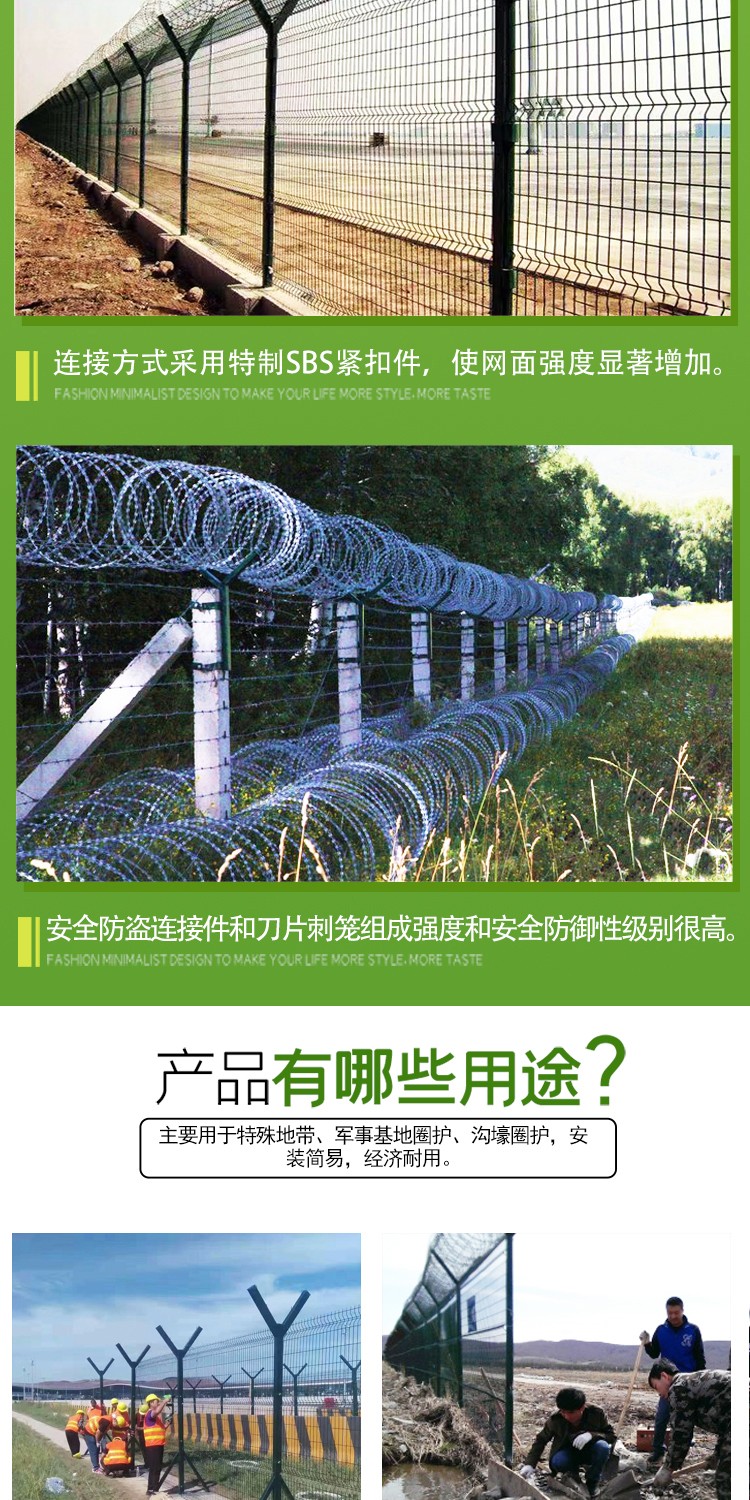 在頂部的V型網(wǎng)可以做網(wǎng)片安裝刀刺網(wǎng)也可以替換成拉絲,安裝簡便快捷,同時能夠節(jié)約成本。立柱頂部的V型支架兩個側(cè)臂焊接有專用的刺網(wǎng)鉤,每一側(cè)架2道鋼絲,形成一個V型槽,然后把刀刺網(wǎng)架到上面,并根據(jù)要求的拉伸間距拉開,再用專門的不銹鋼卡扣把鋼絲和刀刺網(wǎng)卡在一起,可以選擇500mm600mm圈徑的,這樣就完成了整個監(jiān)獄隔離網(wǎng)的安裝。在監(jiān)獄隔離網(wǎng)的上部安裝了帶刀刺網(wǎng)后,會使監(jiān)獄隔鐵絲護(hù)欄網(wǎng)的安全防護(hù)性能得到極大的增強(qiáng),監(jiān)獄鐵絲護(hù)欄網(wǎng)采用熱鍍,噴涂,浸涂等防腐形式,因此具有優(yōu)良的抗老化,防曬,耐候性等特點(diǎn)。