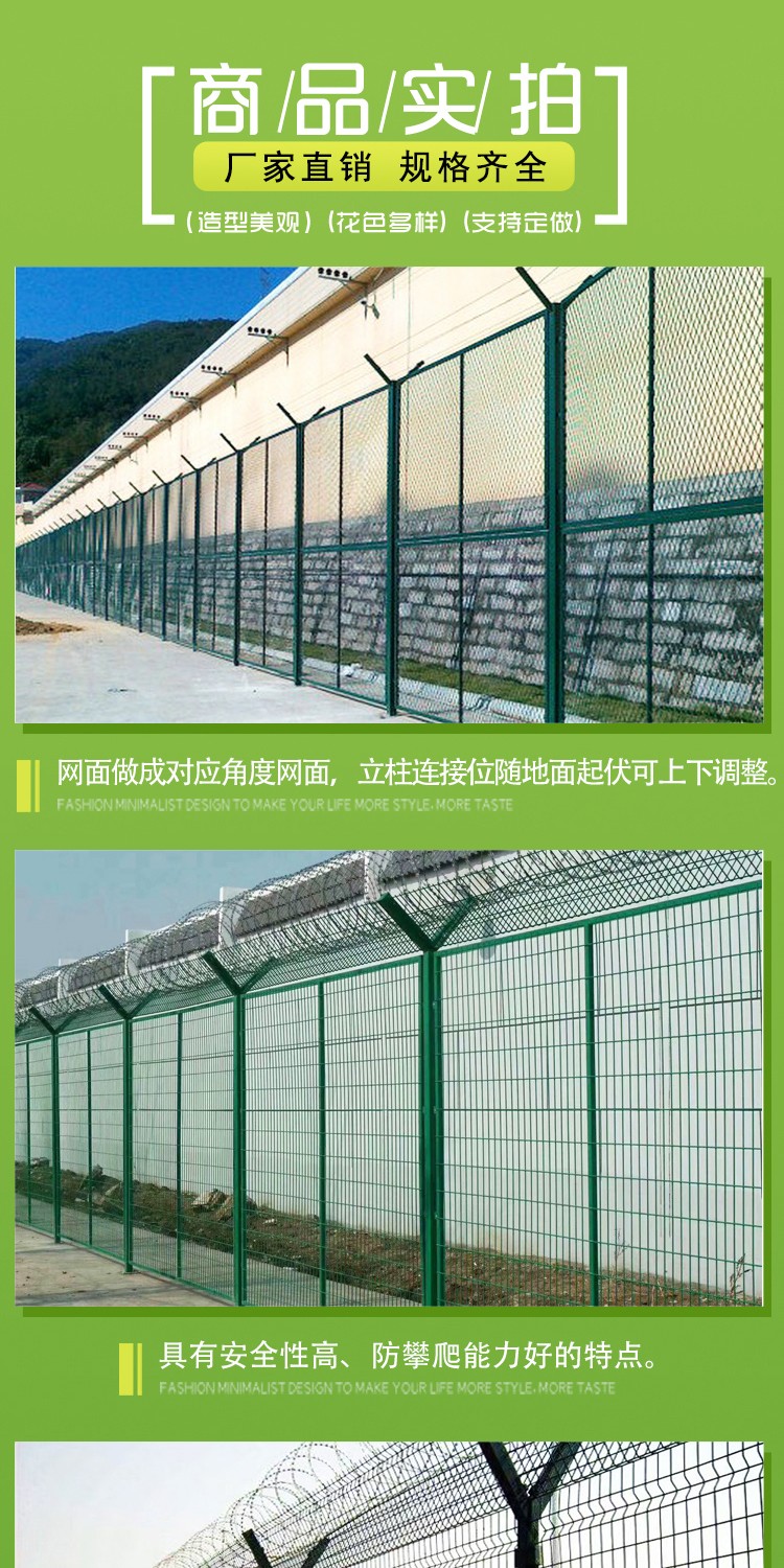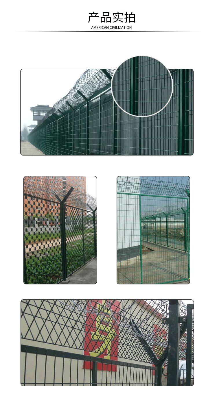 艾瑞監獄看守所防攀爬圍網網片一般都采用邊框型,這樣的生產規格也是為了增加網片的牢固度,因為一般用的都是比較高的。網孔可以焊接成正方形、長方形,也可以焊接成菱形,也可以直接采用刀片刺繩焊接網或鋼板網材料的網片,然后在網片的基礎上四周焊接邊框,可以多選。防腐進行pvc浸塑、噴塑或熱浸鋅處理。頂端安裝刀片刺繩,刀片刺繩擁有鋒利的刀片,手不能握,可以有效的阻止非法分子的攀爬,從而使監獄鋼網墻從外形上邊就可以起到震撼的作用。