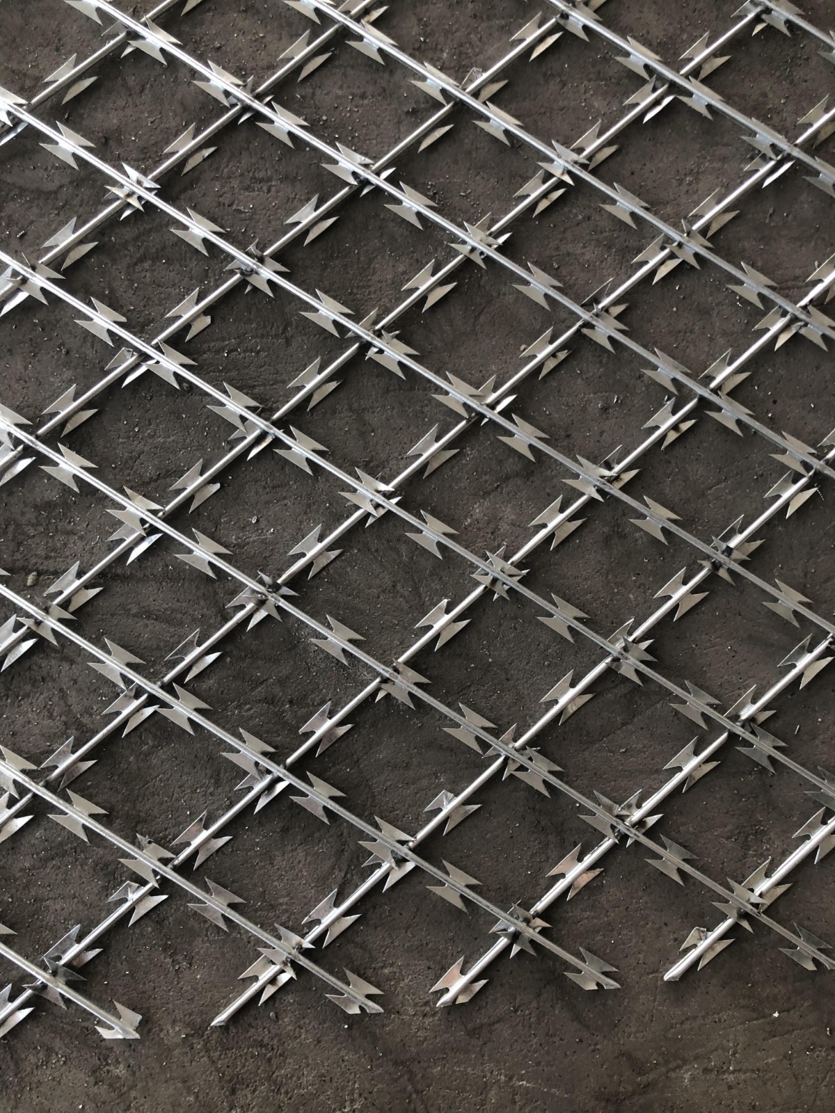 監(jiān)獄焊接刀片刺網網片菱形狀刺網,刀刺網生產工藝:刀片刺網由銳利尖角鍍鋅鋼板或不銹鋼薄板做刀片,鋼絲做芯線組合而成的新型防護產品。鋼網墻表面處理:先鍍鋅,在PVC漫塑,顏色自選,亮麗大方。刀刺網材料有中碳鋼絲、冷軋鍍鋅薄板,不銹鋼板,不銹鋼絲。蛇腹型刀片刺網,上、下掛0.5米的交又蛇腹型刀片刺網片,網采用鋼板沖壓成型包附于鋼絲(筋絲)之上,由鎖利尖角鋅鋼板或不銹鋼薄板做刀片,高張力鋼絲做芯線組合而成的。鋒利的刀型刺由雙線扣裝后成蛇腹狀既美觀又讓人不寒而要,起到了很好的阻嚇作用。至于上下螺旋刀片刺網的中間部分,形成的網片是75mm*150rm孔l的刺網片,高度上具有防攀。全防護特性特性,刀片刺網和蛇腹網結合使用,使人望而卻步,擊破人的僥幸心理.