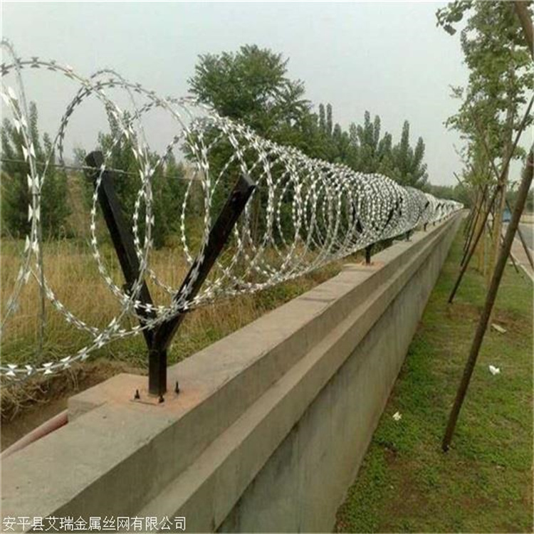 3、圍墻上刺絲滾籠與之相鄰兩圈每隔120度用刺絲連接卡固定張開后形成蛇腹網狀,閉合后機場刀刺網卷徑為500mm,張開后每交又圈安裝間距20cm,直徑不小于450mm。